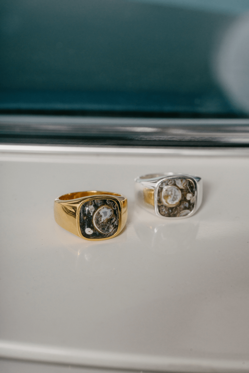 Unisex signetring med mjuka kanter och en Turtle Agate natursten. • Stilens topplatta mäter 14 x 14 mm.• Smycket är tillverkat av 100% återvunnet 22 karats guldpläterat 925 sterlingsilver. • Alla våra smycken är stämplade med 925 IX inuti – vår professionella namnstämpel, registrerad av den danska ädelmetallkontrollen.