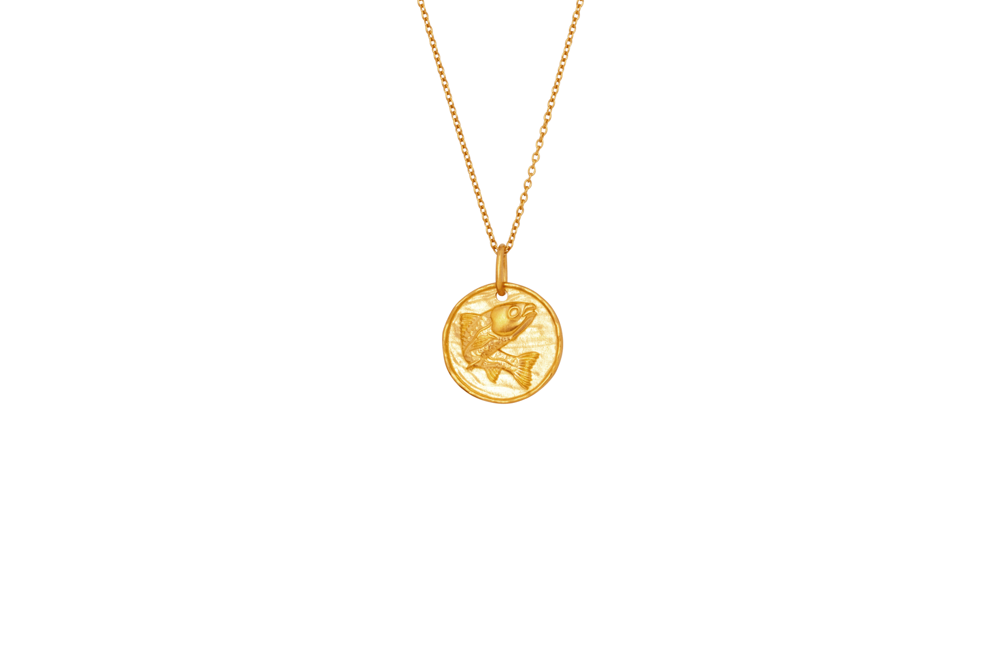 Fisken är fantasifull och frigjord och sägs i zodiaken ”vara född till konstnär”. Fisken är omtänksam och ger gärna en hjälpande hand där det behövs. • Smycket är 1,7 cm i diameter.• Smycket är tillverkat av 100% återvunnet 22 karats guldpläterat 925 sterlingsilver. • Alla våra smycken är stämplade med 925 IX inuti, vår professionella namnstämpel, registrerad av den danska ädelmetallkontrollen.