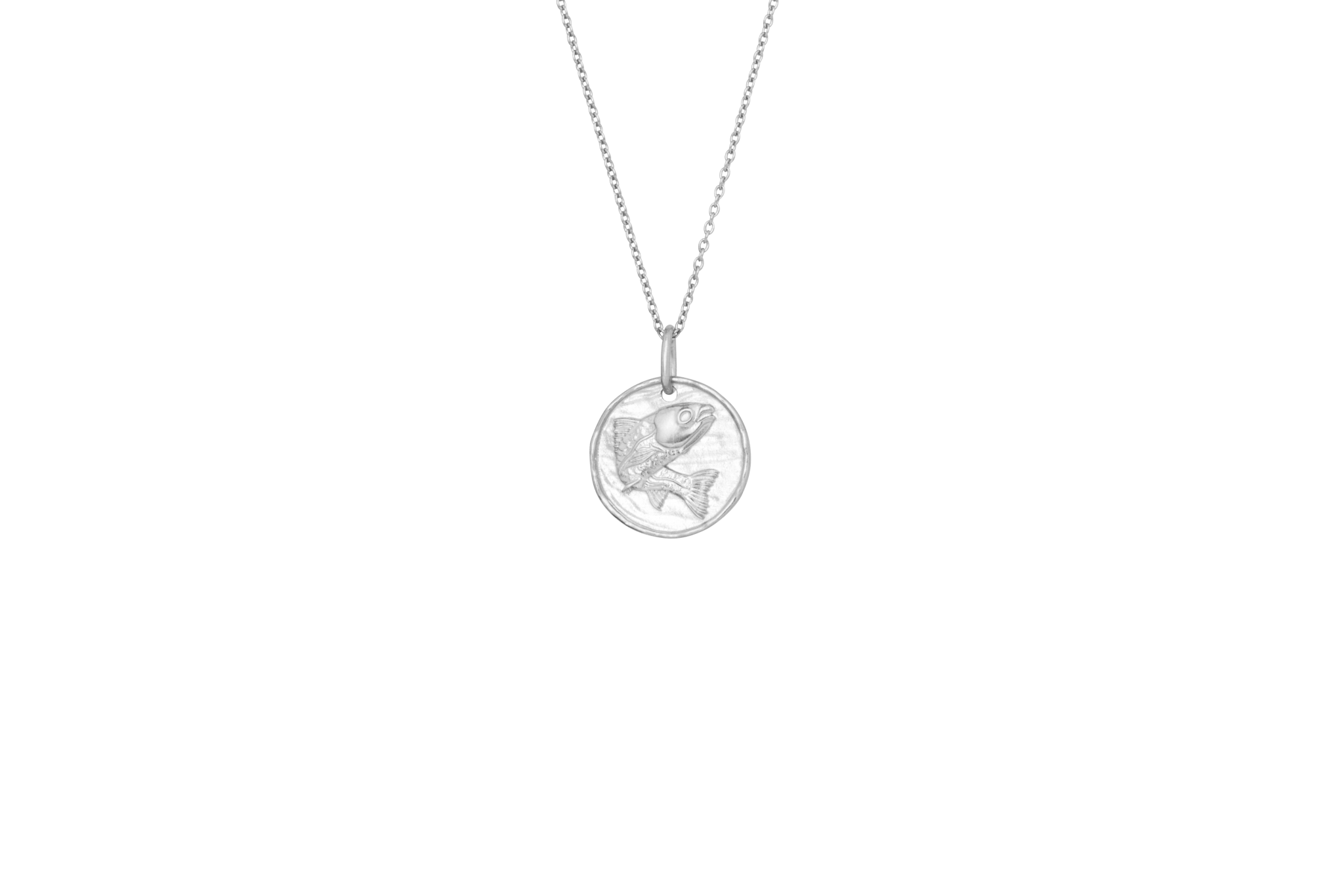 Fisken är fantasifull och frigjord och sägs i zodiaken ”vara född till konstnär”. Fisken är omtänksam och ger gärna en hjälpande hand där det behövs. • Smycket är 1,7 cm i diameter.• Smycket är tillverkat av 100% återvunnet 925 sterlingsilver.  • Alla våra smycken är stämplade med 925 IX inuti, vår professionella namnstämpel, registrerad av den danska ädelmetallkontrollen.