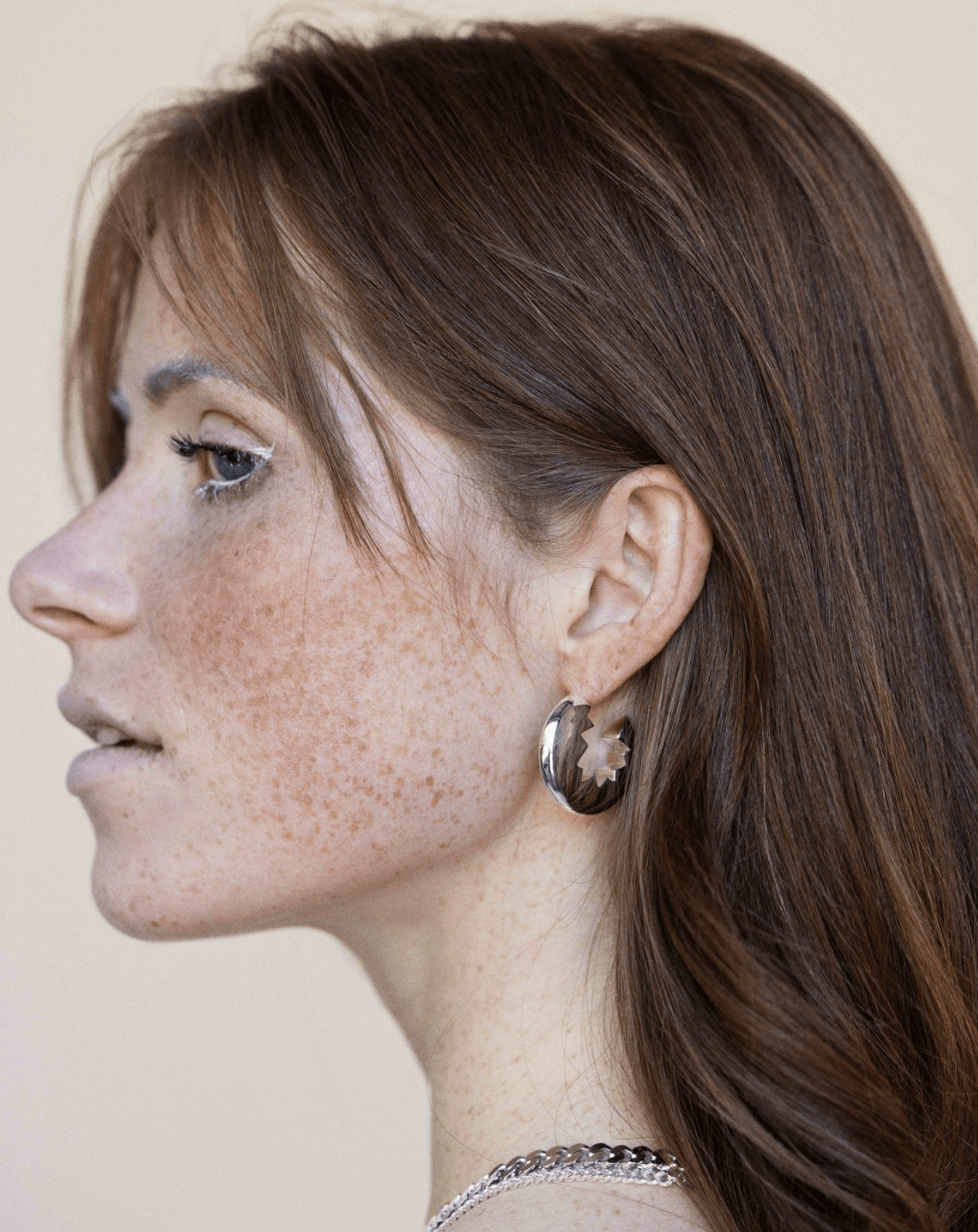 Chunky, edgy och isiga örhängen.• Smycket är tillverkat av 100% återvunnet 22 karats guldpläterat 925 sterlingsilver. • Ytterdiametern är 29 mm.• Alla våra smycken är stämplade med 925 IX inuti – vår professionella namnstämpel, registrerad av den danska ädelmetallkontrollen.