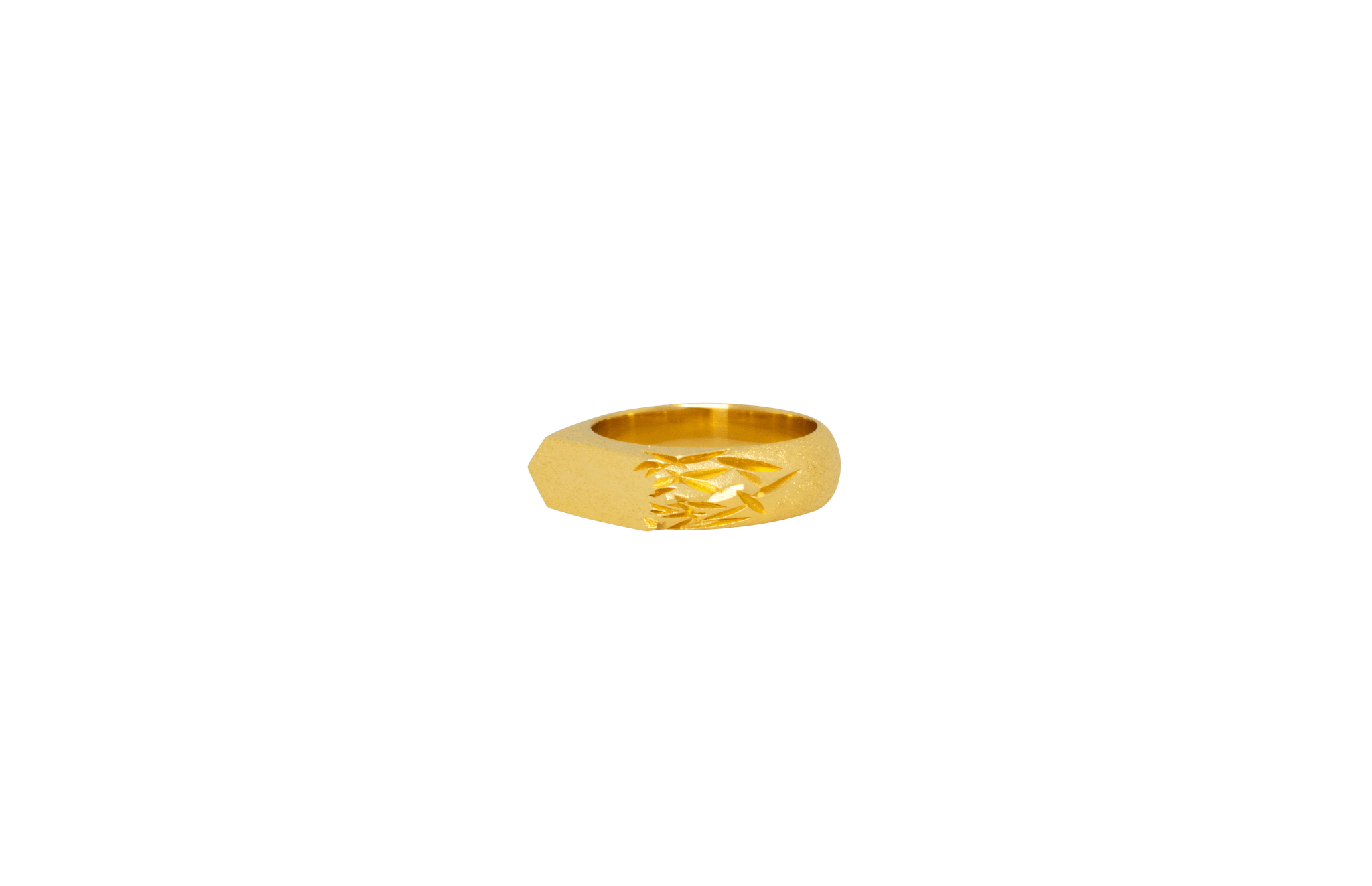 En ring med skarpa linjer, en opolerad look och råa detaljer.• Topplattan på ringen mäter 6 x 18 mm.• Detta smycke är tillverkat av 100% återvunnet, 22 karat guldpläterat 925 sterlingsilver.• Alla våra smycken är stämplade med 925 IX på insidan, vilket är vårt professionella varumärkesstämpel registrerat hos den danska ädelmetallkontrollen.