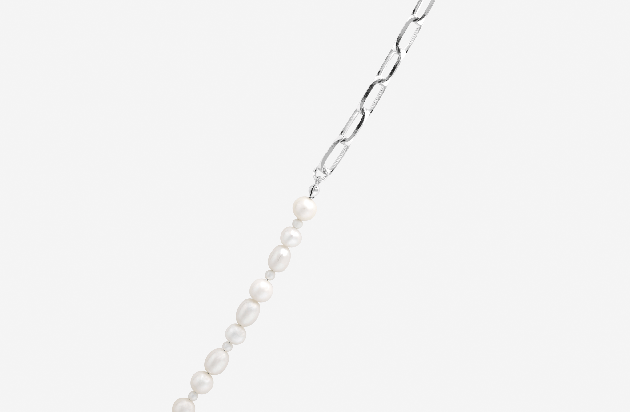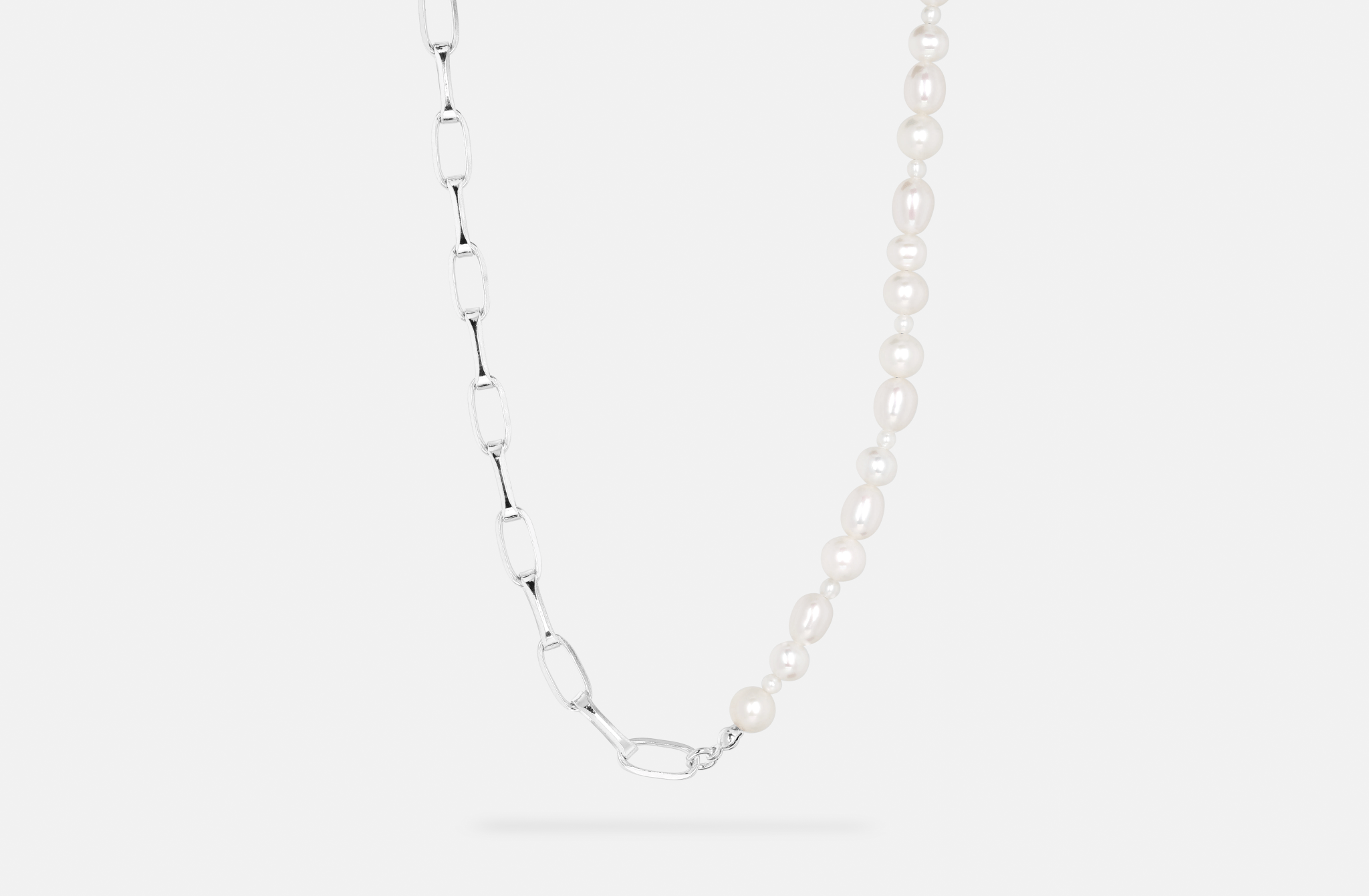 Vi har skapat en modern kedja som kombinerar det råa från vår IX Prestige-kedja med pärlornas klassiska stil. Den ofullkomliga looken på varje pärla bidrar till att göra varje kedja lika unik som den person som bär den.