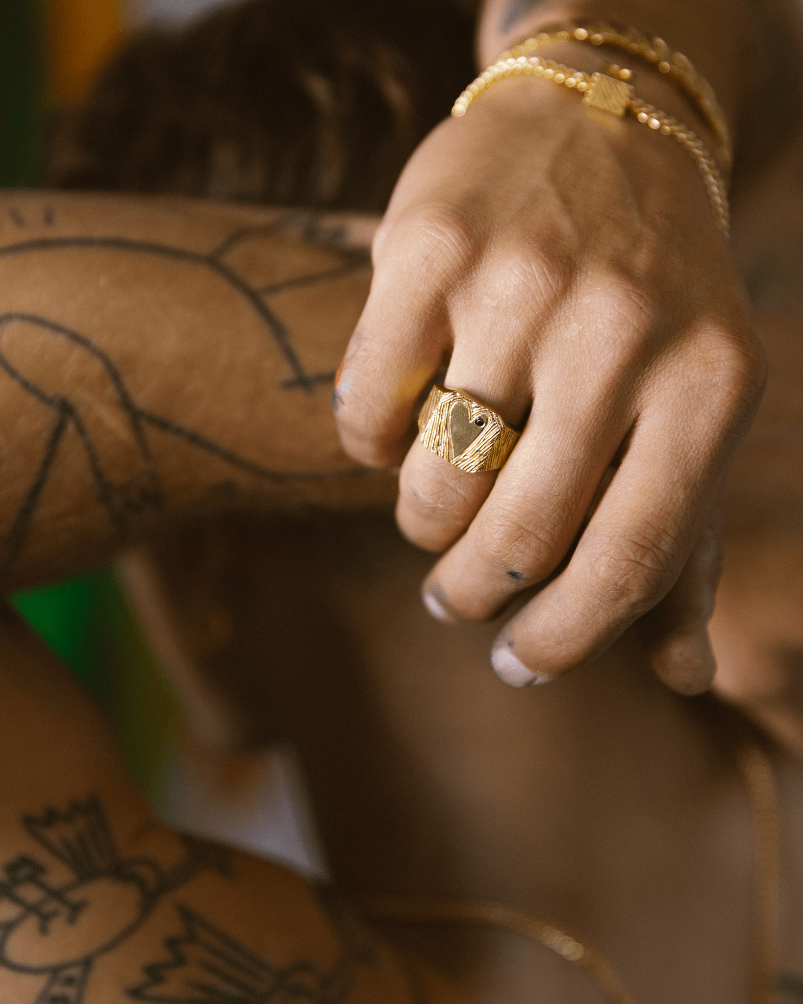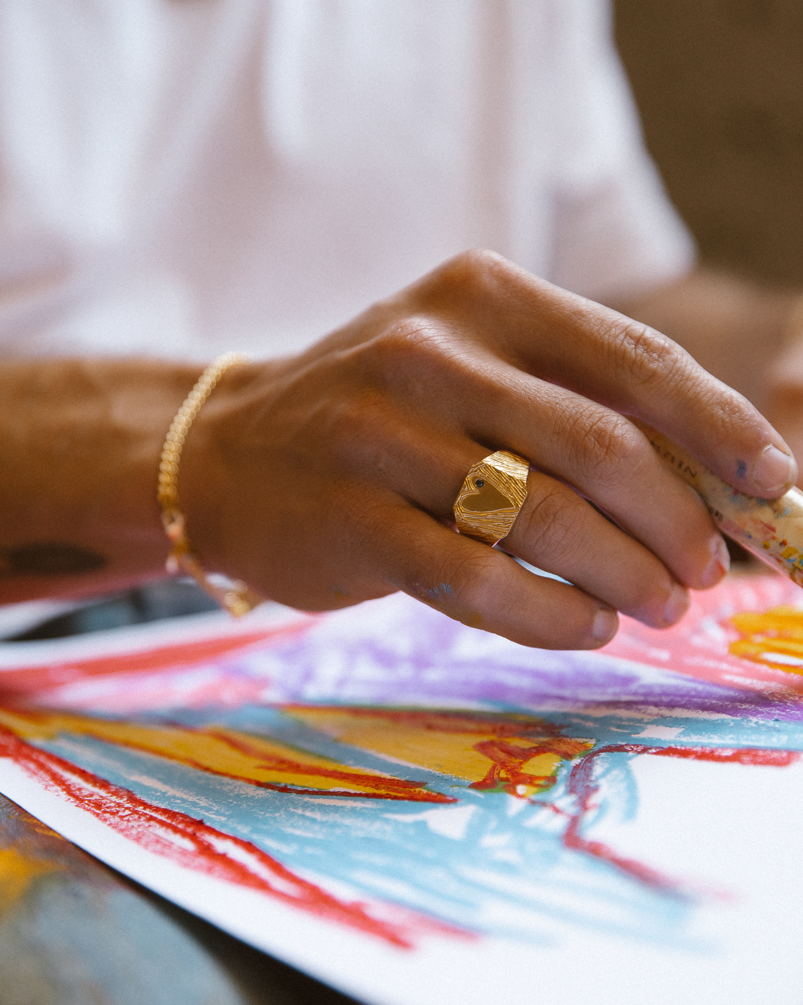 Solid signetring designad av konstnären Martin Brachér. Den här ringen är en påminnelse om att uppskatta de små ögonblicken i livet. Den svarta gnistrande stenen symboliserar både det oändliga universum och vår dyrbara tid på jorden.Limited Edition-smycke av konstnären Martin Brachér.Ringen är tillverkad av 100% återvunnet 22 karats guldpläterat 925 sterling silver.Stenen i ringen är en svart zirkoniasten.Ringens ovansida mäter 15 x 15 mm. Alla våra smycken är stämplade med 925 IX på insidan, vilket är vår professionella namnstämpel, registrerad av Danish Precious Metals Control.