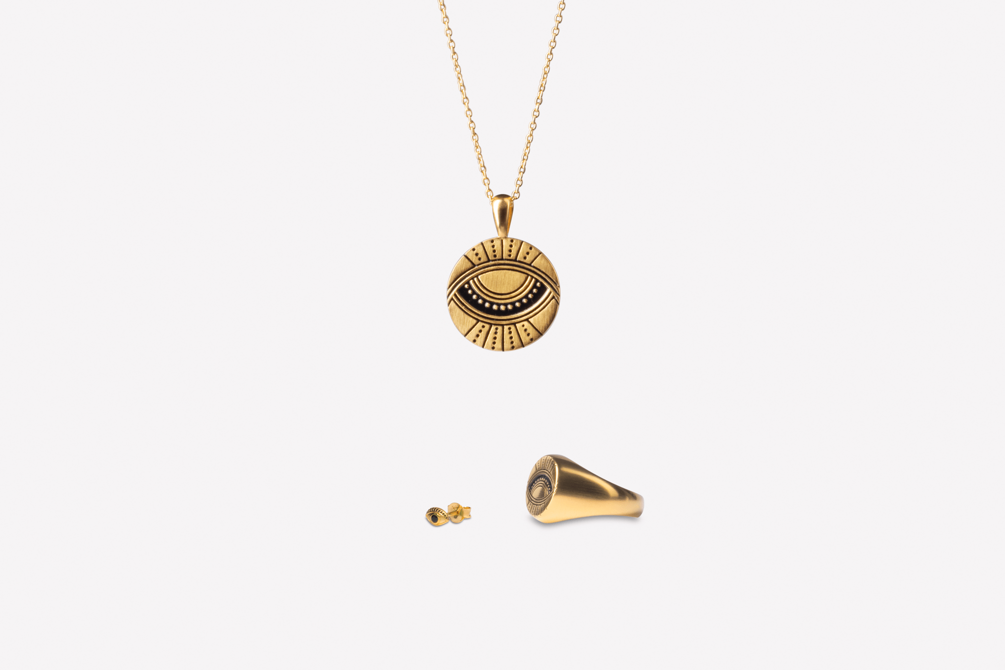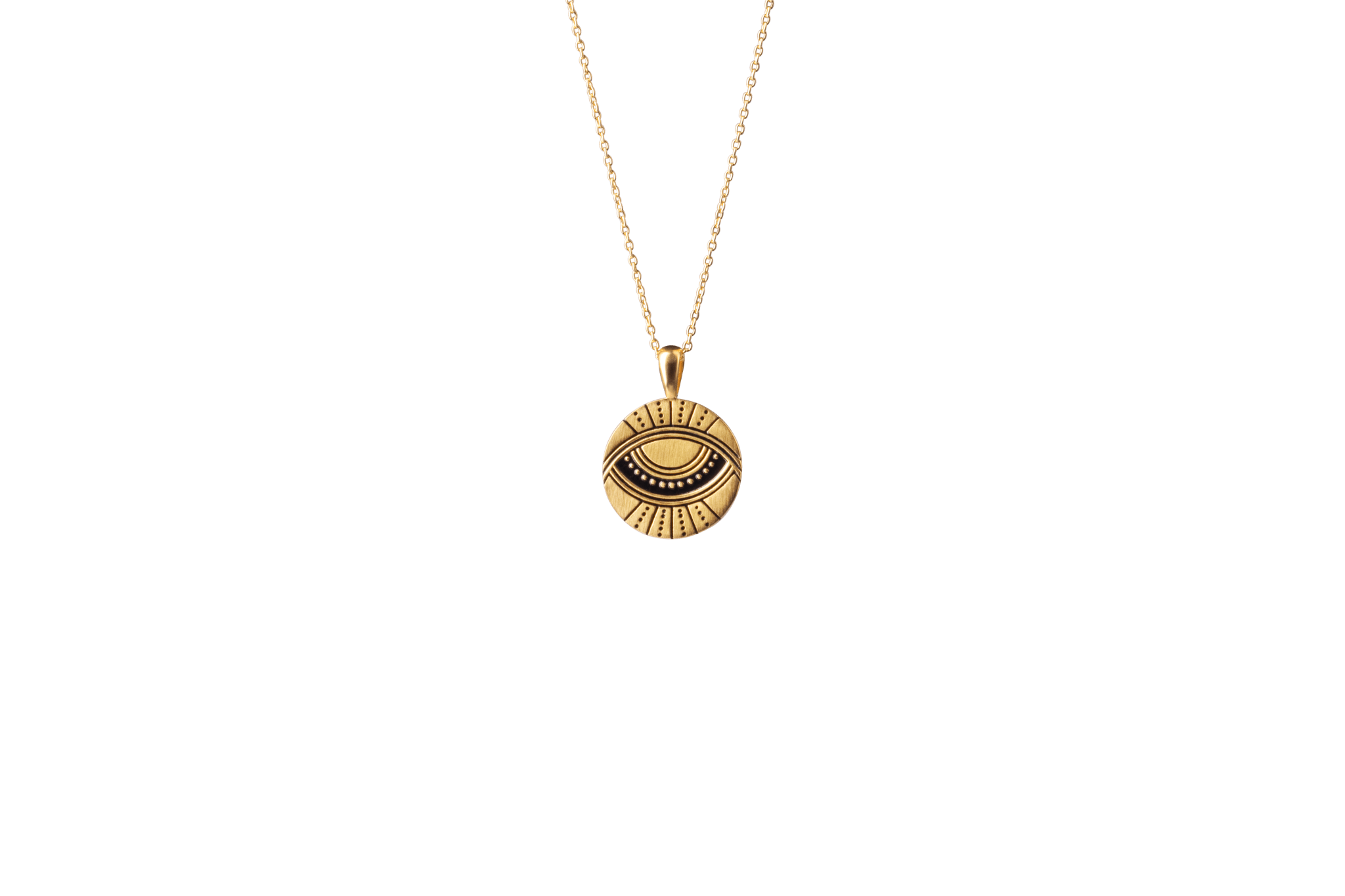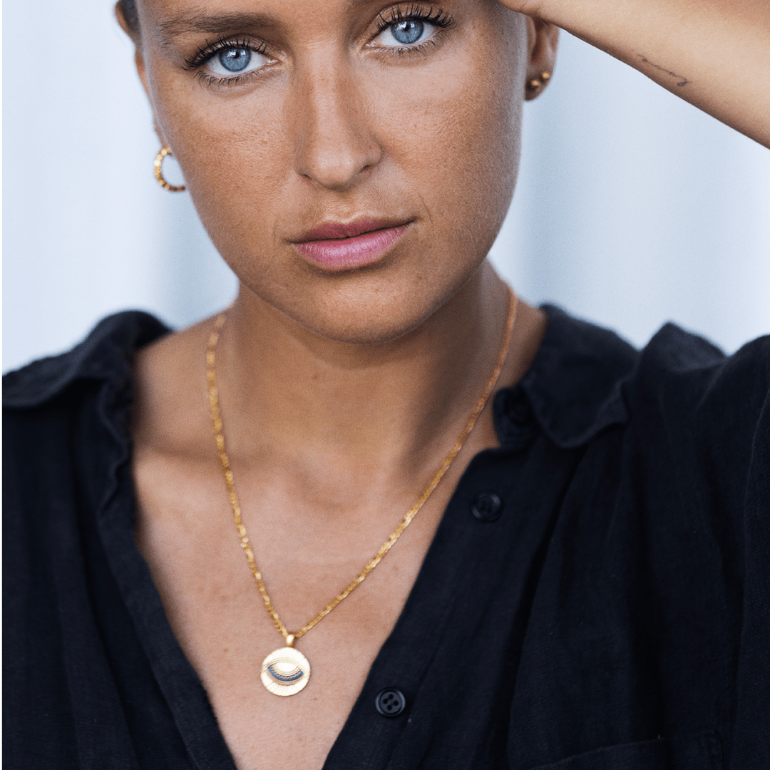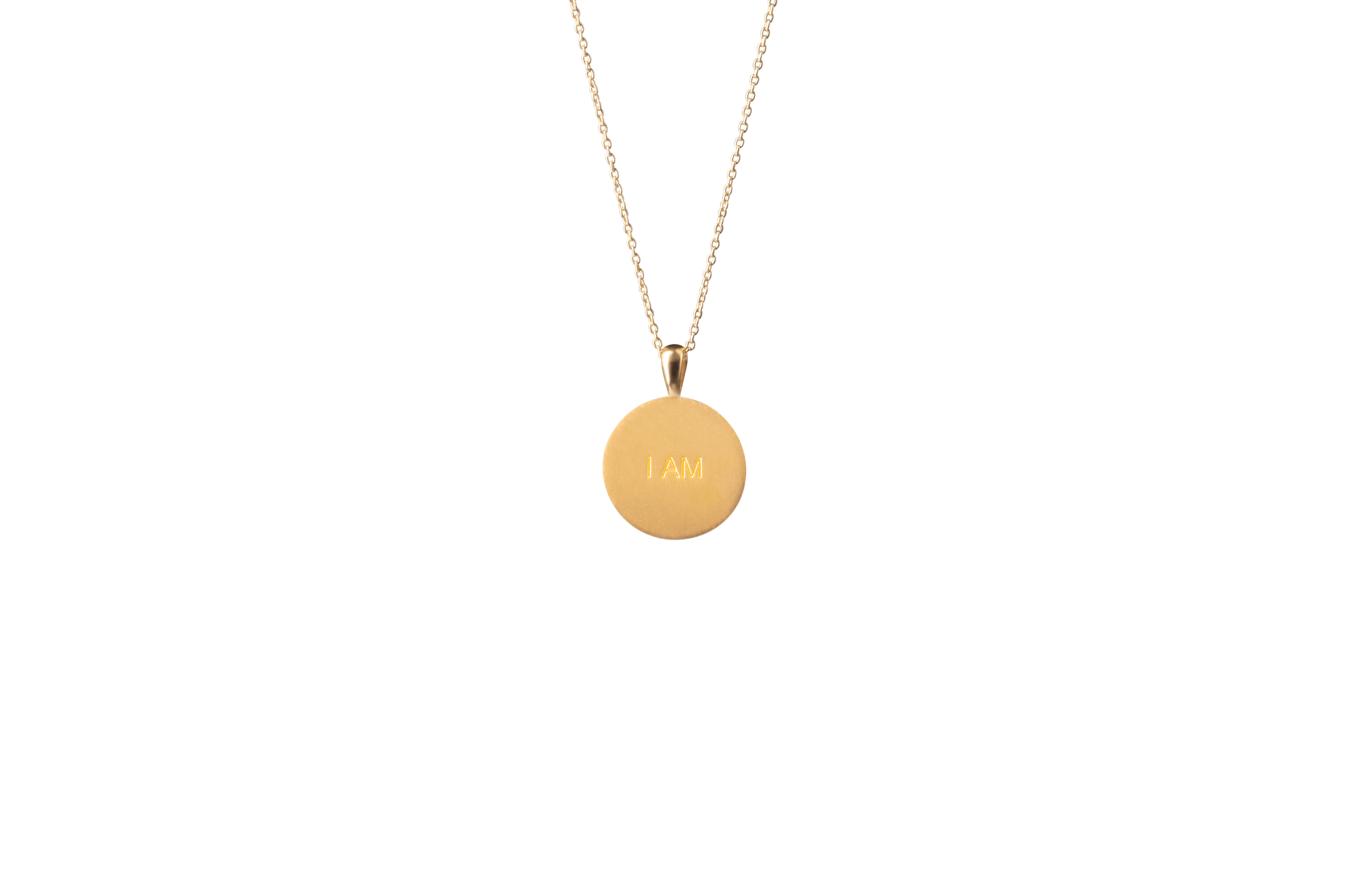 The "I AM" affirmation and the symbol of an eye support each other's synergy and create a harmonious fusion of self-empowerment and soulful introspection. When you wear the pendant, you will experience a powerful energy that strengthens your confidence and affirms your limitless potential. • The pendant is made from 100% recycled 22 karat gold-plated 925 sterling silver. • The pendant is reversible, therefore you have two pendants in one.• The pendant measures 18 mm in diameter. • All our jewellery is stamped with 925 IX inside, which is our own hallmark registered with the Danish Assay Office.