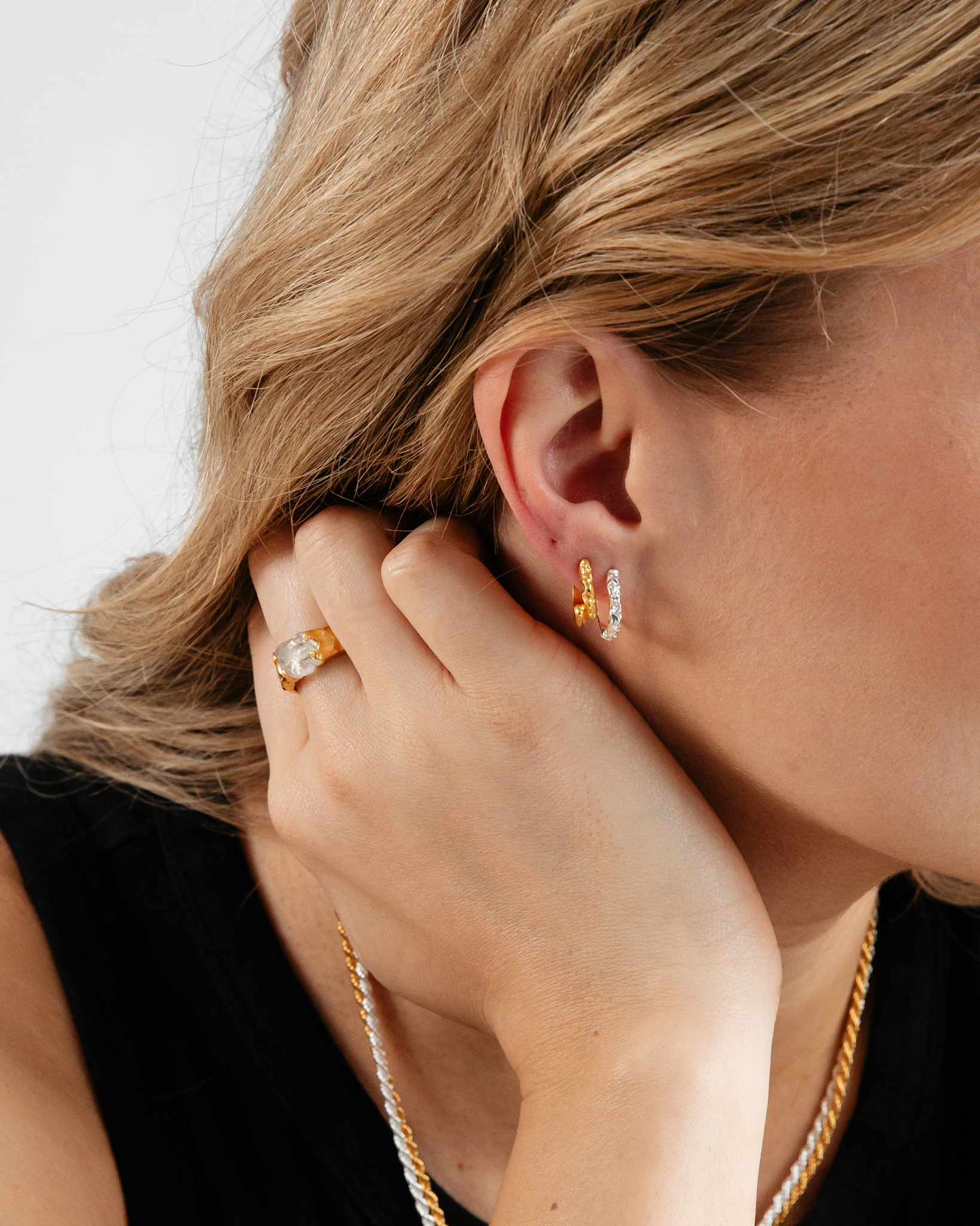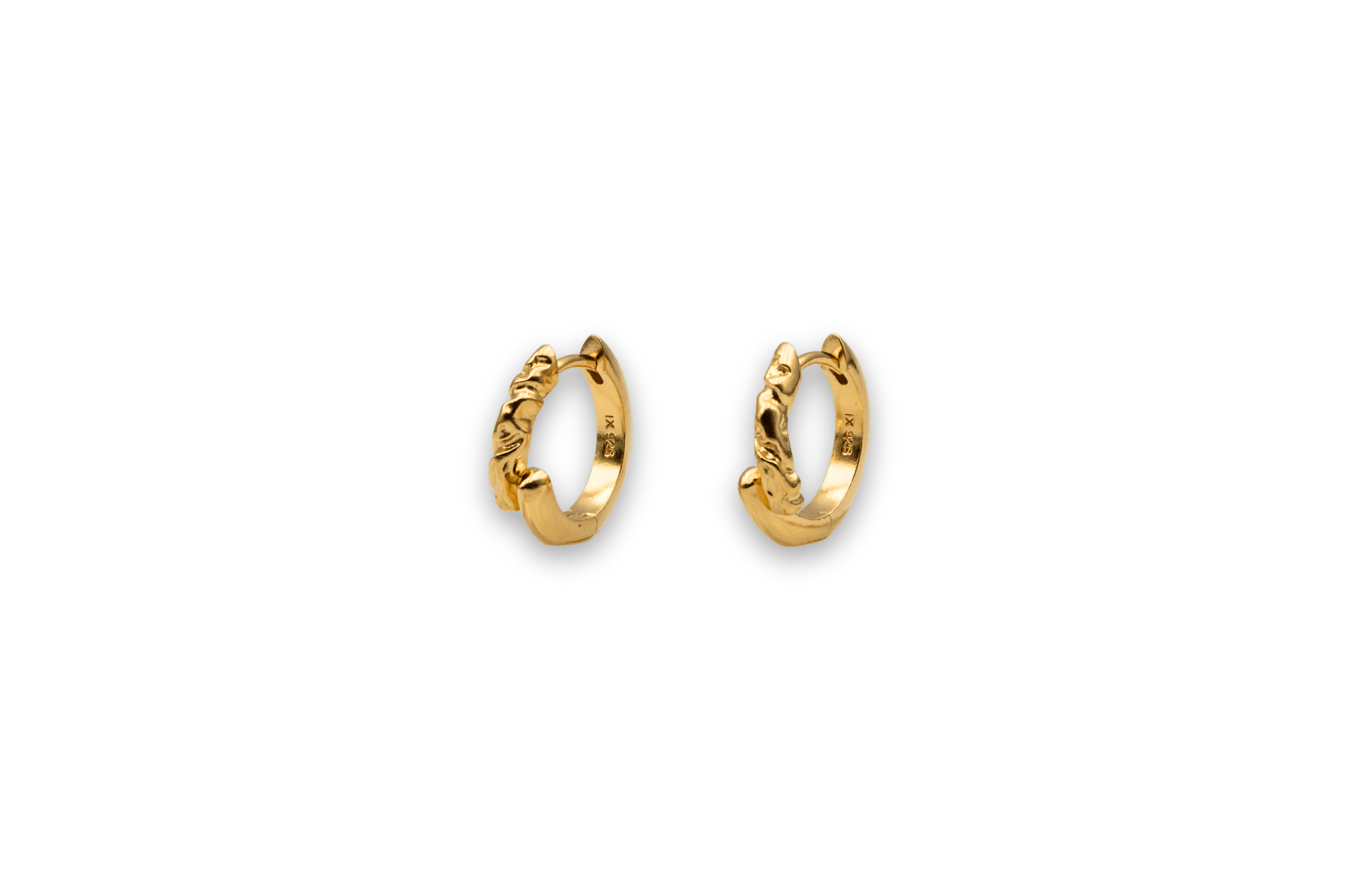 Dessa hoop-örhängen är inspirerade av naturens element – berg, stenar och sandens strukturer. Deras unika design fångar naturens råa skönhet och tillför en organisk touch till din smyckessamling.Rustic-örhängena är unisex, designade för att passa både män och kvinnor, och finns i både guldpläterad och silver.
