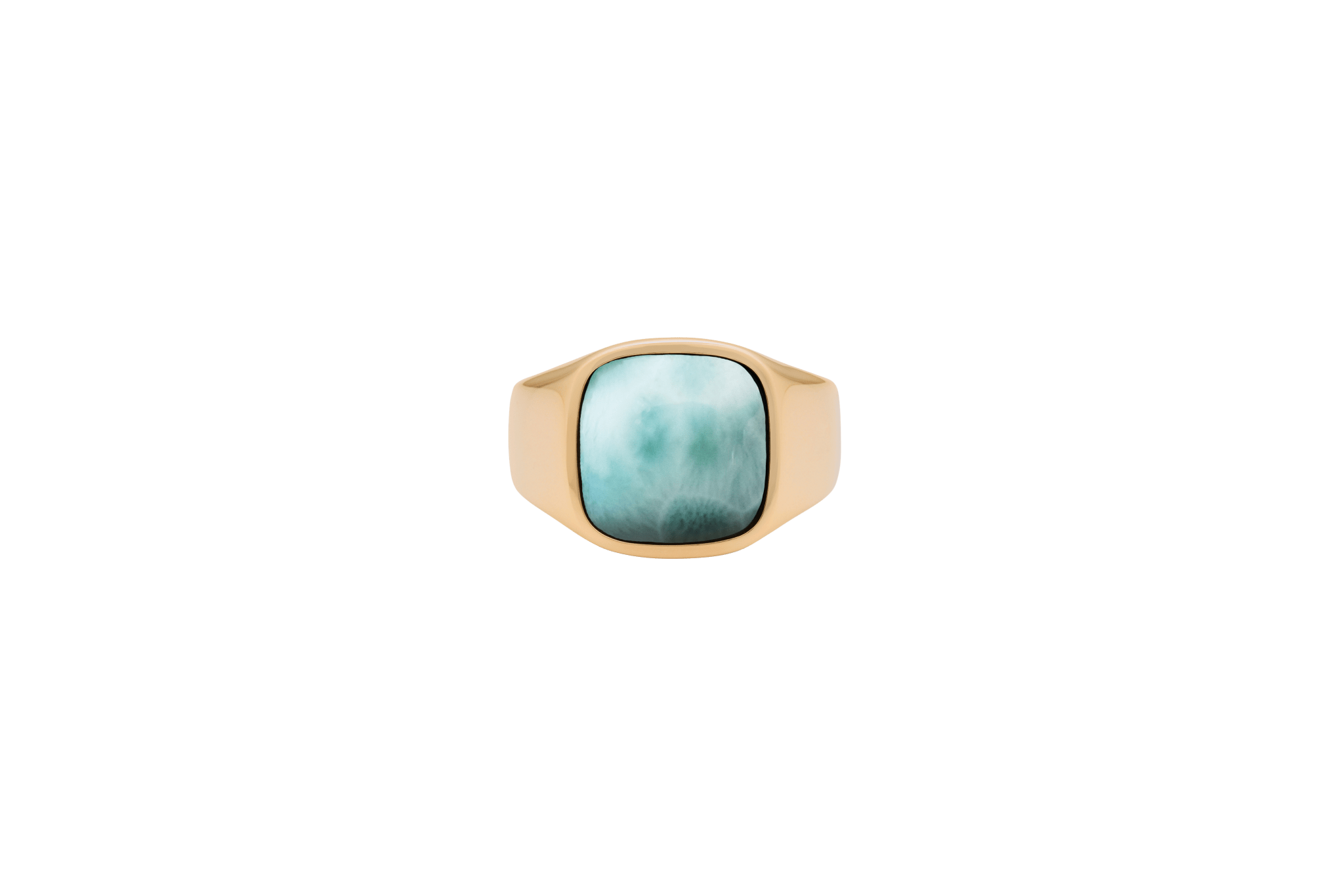 Unisex signetring med mjuka kanter och en Larimar. • Stilens topplatta mäter 14 x 14 mm.• Smycket är tillverkat av 100% återvunnet 22 karats guldpläterat 925 sterlingsilver. • Alla våra smycken är stämplade med 925 IX inuti – vår professionella namnstämpel, registrerad av den danska ädelmetallkontrollen.