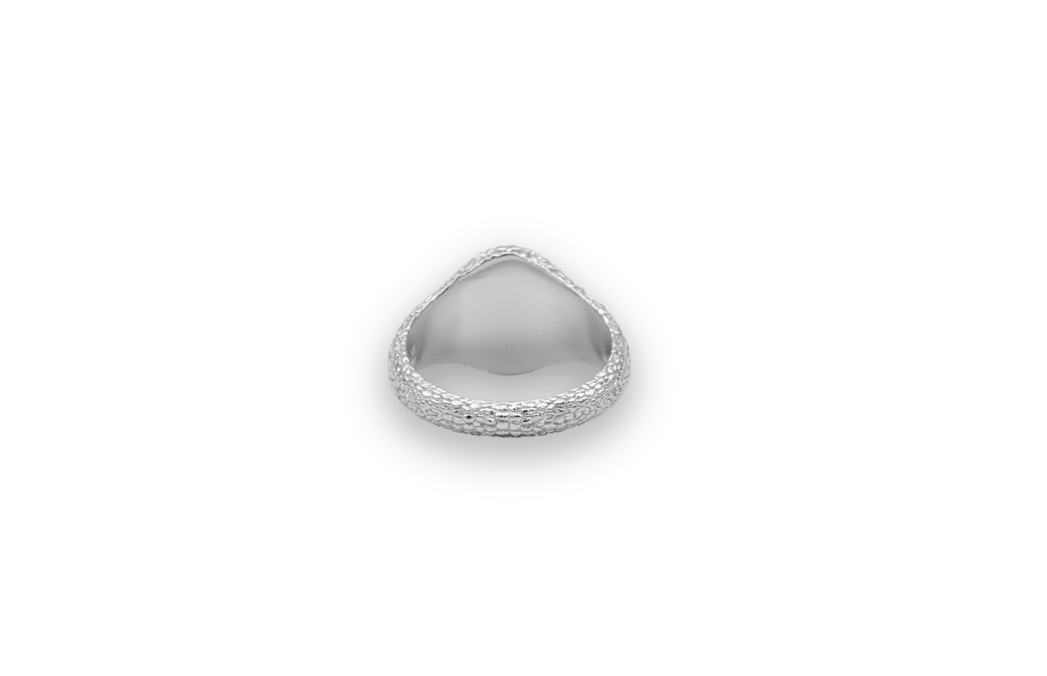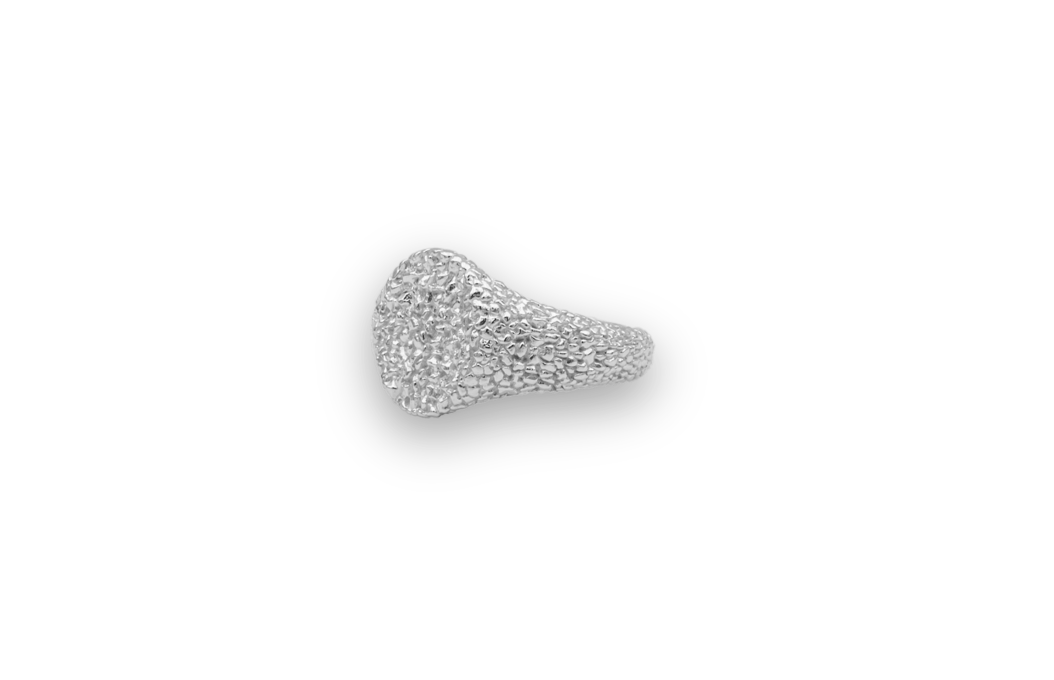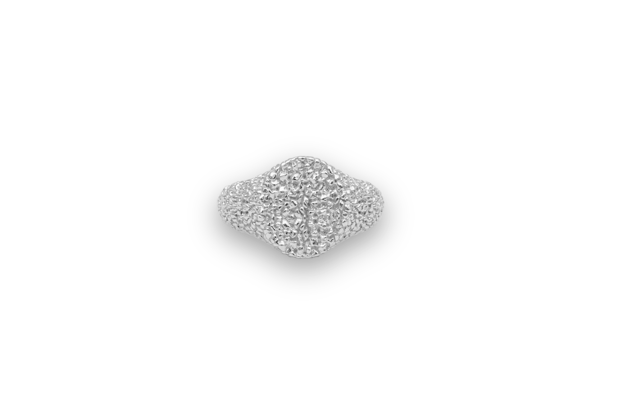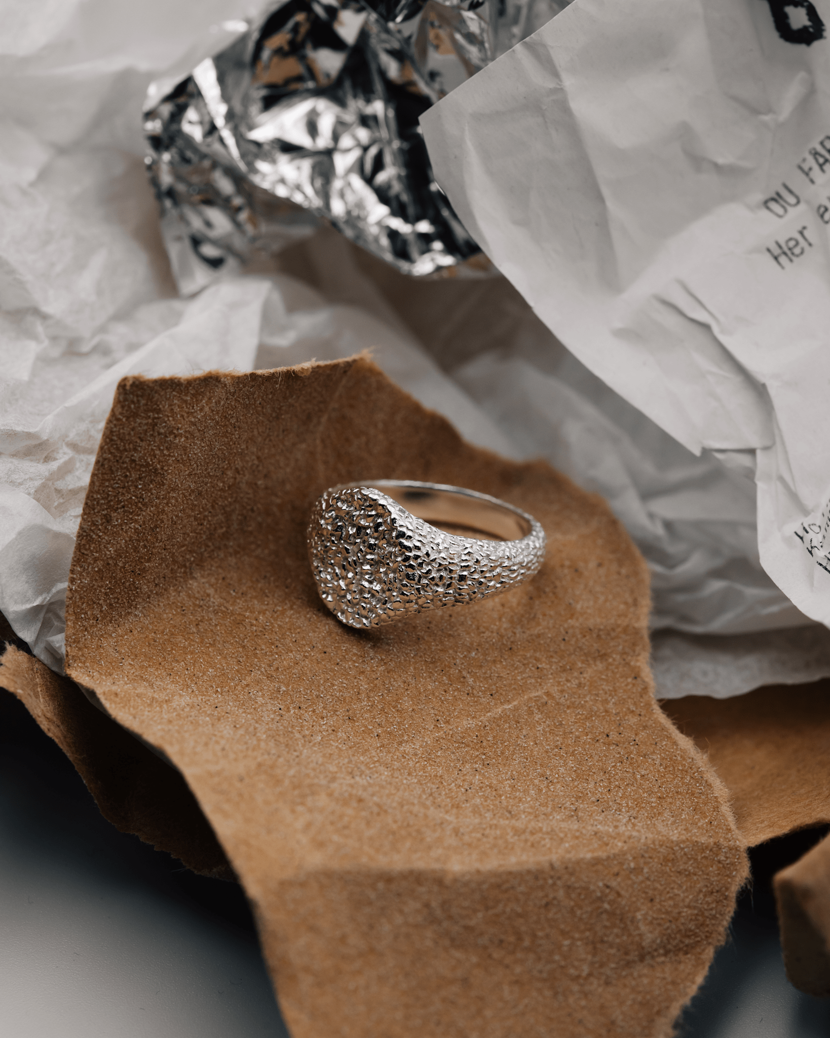 Den tidlösa Mini Oval Signet-ringen har en unik crunchy yta som ger en modern touch. Denna statement-ring tillför edge till din stil och kan bäras ensam eller kombineras med andra ringar.Våra ringar är unisex och passar både män och kvinnor. Denna ring finns både i silver och guldpläterad.