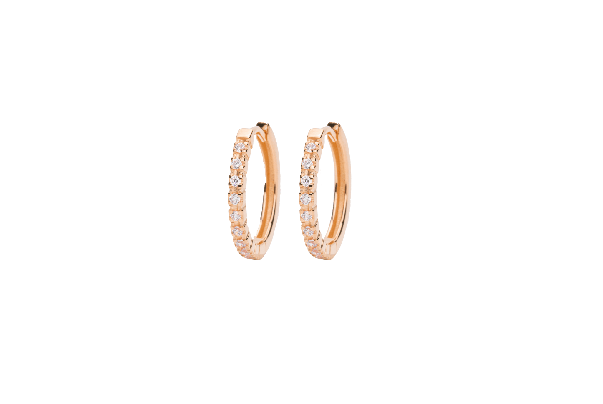 Elegant hoops with diamond stones.• The earring measures 15.4 mm in outside diameter and 12 mm i inside diameter.• The earring is made of 14 karat massive gold with diamond stones.• 9 pcs. of diamonds each earring.• The earring is stamped with 585 IX inside, which is our own hallmark registered with the Danish Assay Office.Order items: • Estimated delivery is 12 weeks from order date.• The product cannot be returned.• After ordering, you will be contacted by email to confirm the order.• If any questions regarding product or process, please contact us on hello@ixstudioscph.com